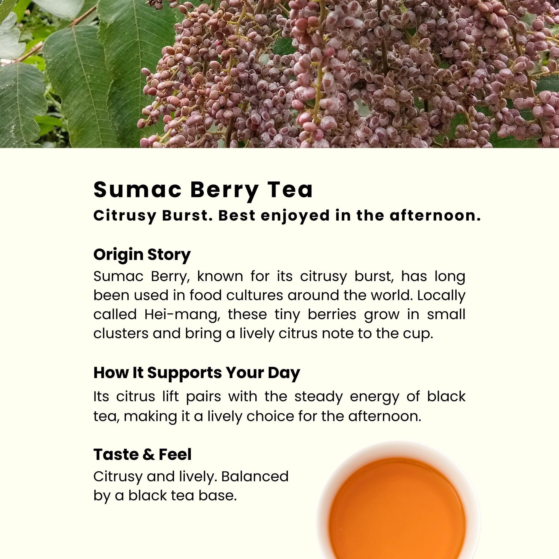 Sumac Berry, known for its citrusy burst, has long been used in food cultures around the world. Locally called Hei-mang, these tiny berries grow in small clusters and bring a lively citrus note to the cup.